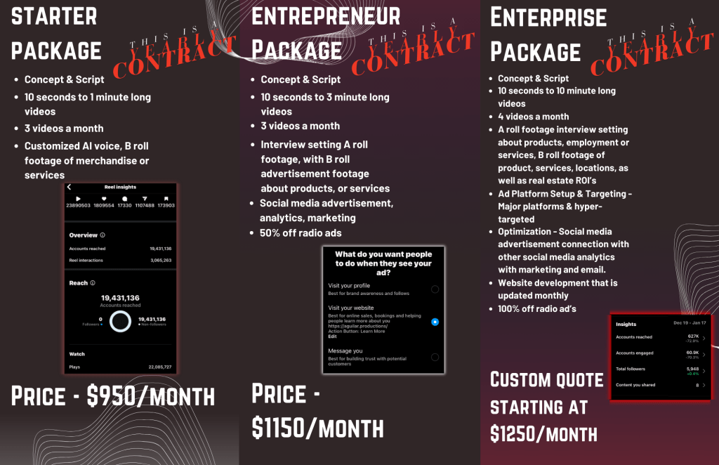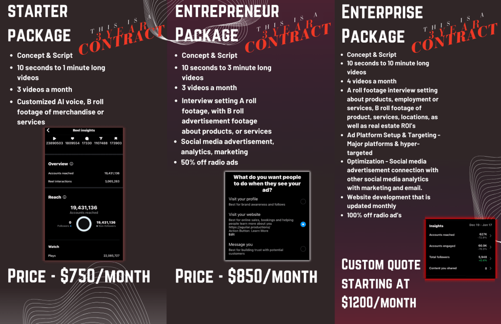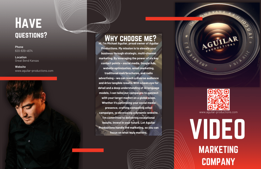 Hi, I’m Michael Aguilar, proud owner of Aguilar Productions. My mission is to elevate your business through strategic, multi-channel marketing. By leveraging the power of six key contact points – social media, Google Ads, website optimization, email marketing, traditional mail/brochures, and radio advertising – we can reach a diverse audience and drive tangible results. With a keen eye for detail and a deep understanding of AI language models, I can tailor our campaigns to connect with your target market on a global scale. Whether it’s optimizing your social media presence, crafting compelling email campaigns, or developing a dynamic website, I’m committed to delivering exceptional results. Invest in your future. Let Aguilar Productions handle the marketing, so you can focus on what truly matters.